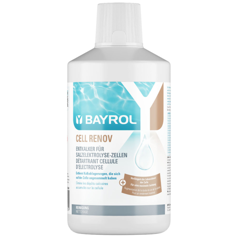 Eine Reinigung wäre in solch einem Fall notwendig. Anorganische Ablagerungen wie Kalk oder Rost lassen sich am besten mit einem sauren Reiniger behandeln. Bayrol Cell Renov ist genau hierauf spezialisiert.