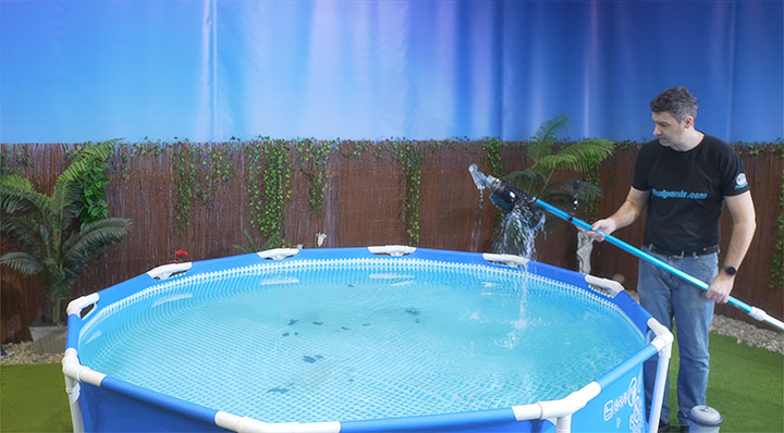Schaltet Eure Poolpumpe aus und wartet ca. 10 bis 20 Minuten, damit möglichst viele Schmutzpartikel zum Boden Absinken können.