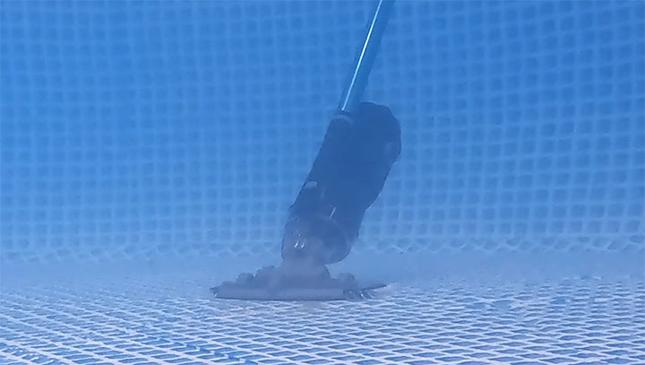 Es wurde ein komplett verdreckter Pool mit 305 cm Durchmesser gereinigt. Nicht einmal 8 Minuten Echtzeit (inklusive einmal Entleeren des Filterbehälters zwischendrin) und schon waren wir fertig. Das leigt einerseits daran, dass der BWT Poolsauger FSA400 sehr stark ist und andererseits, weil er viel weniger als sein Vorgänger zu Aufwirbelungen tendiert. Uns kommt er auch ein klein wenig stärker als der Vorgänger vor. Die Randbereiche ließen sich auch mit dem breiten Sauger sehr gut treinigen.