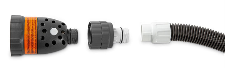 Diese Stücke müssen zusammengebaut an Intex-38 mm Anschöüssen befestigt werden. Die Überwurfmutter passt nicht auf die Gewinde der 32er Anschlüsse! Wichtig: druckseitiger Anschluss, sonst geht gar nichts.